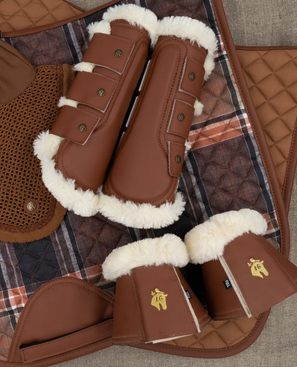 Constructed with a neoprene foam base & leatherette, leather alternative outer layer for overreach protection. Faux fur trim for anti-rub & specialized hook & loop closure.