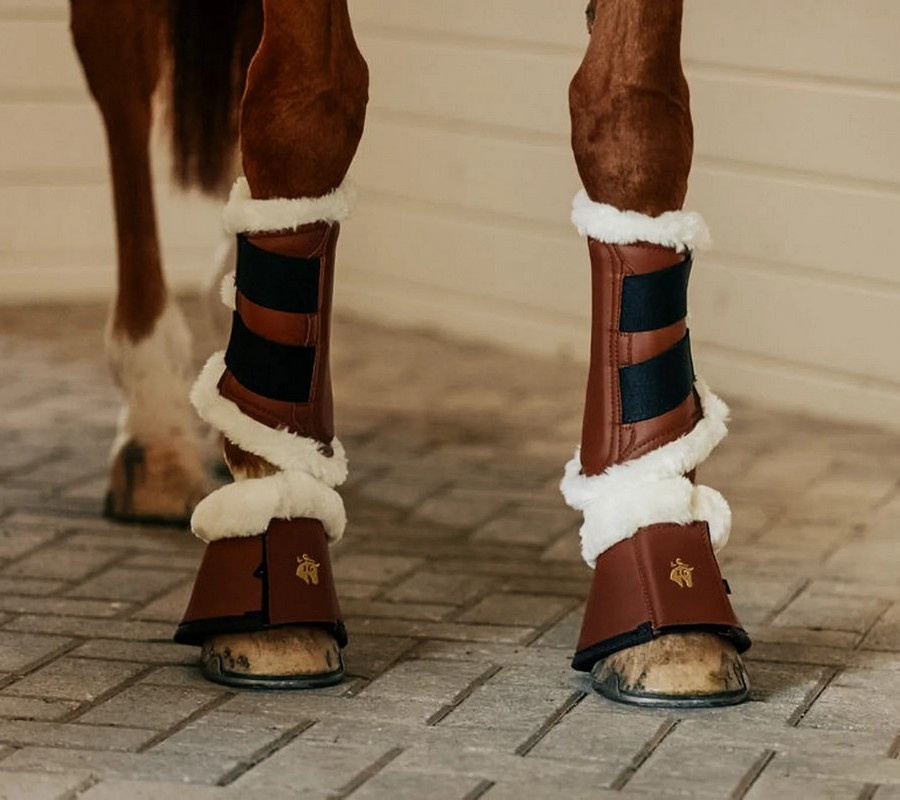 Set of 2Leather alternative outerSoft padded faux fur liningElastic with specialized hook & loop closure16C brass logo rivets