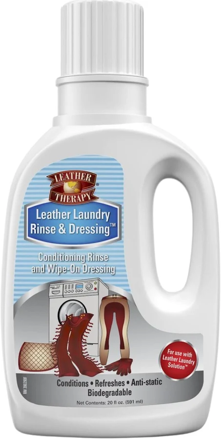 Leather Laundry Solution, this non-detergent conditioning rinse was made specifically for natural or synthetic leather, fabric and sheepskin. A high-efficiency formula, add the Rinse & Dressing to cold water during the last rinse cycle or wipe it on brittle leather after washing. Made to moisturize and combat static, you’ll be amazed by your extra-soft leather after use!