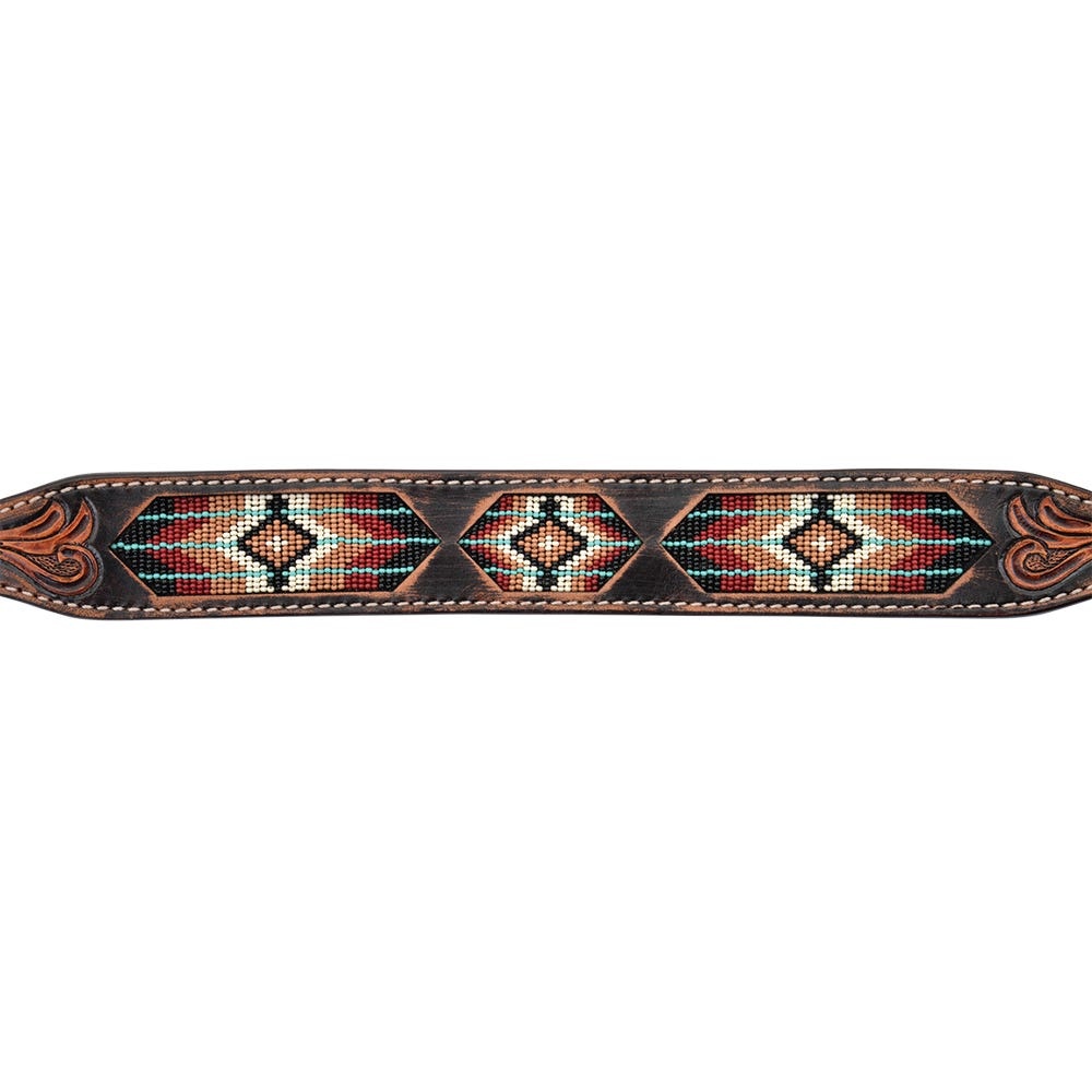 Circle Y Southwestern Beaded Tack features distressed top grain leather for a rustic look with an attractive beaded underlay in earthy brown and rust hues accented by turquoise, finished off with antique berry conchos and stainless hardware. This fantastic set coordinates beautifully with just about any saddle color. Accentuate your horses colorful personality with the breast collar or the complete set.