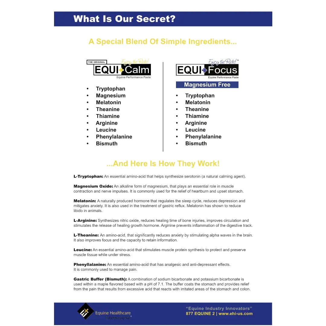 Contains tryptophan, magnesium, melatonin, theanine, thiamine, arginine, leucine, phenylalanine and bismuth. All ingredients are "show safe" and are not currently listed on the USEF or AQHA prohibited substances list. Does not impede athletic performance; does not cause excessive acid production.