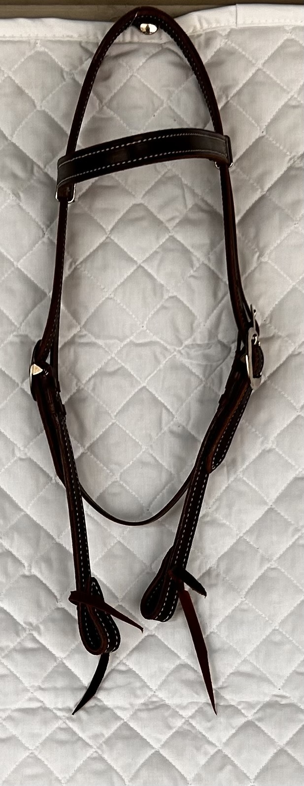 Beautifully Handmade Chocolate brown headstall with white stitching throughout it.