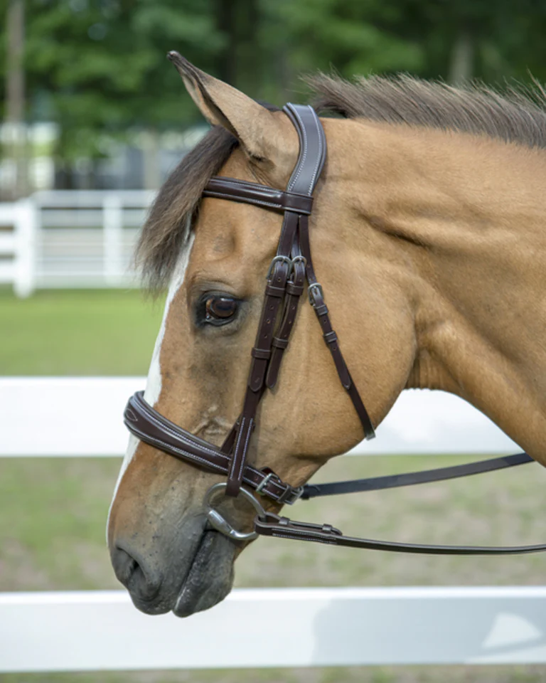 This Henri de Rivel Pro Mono Crown Padded Wide Noseband Bridle with fancy stitching offers classic style and comfort. The single crownpiece and padded wide noseband are designed to distribute pressure evenly and cradle sensitive facial and cranial bones.