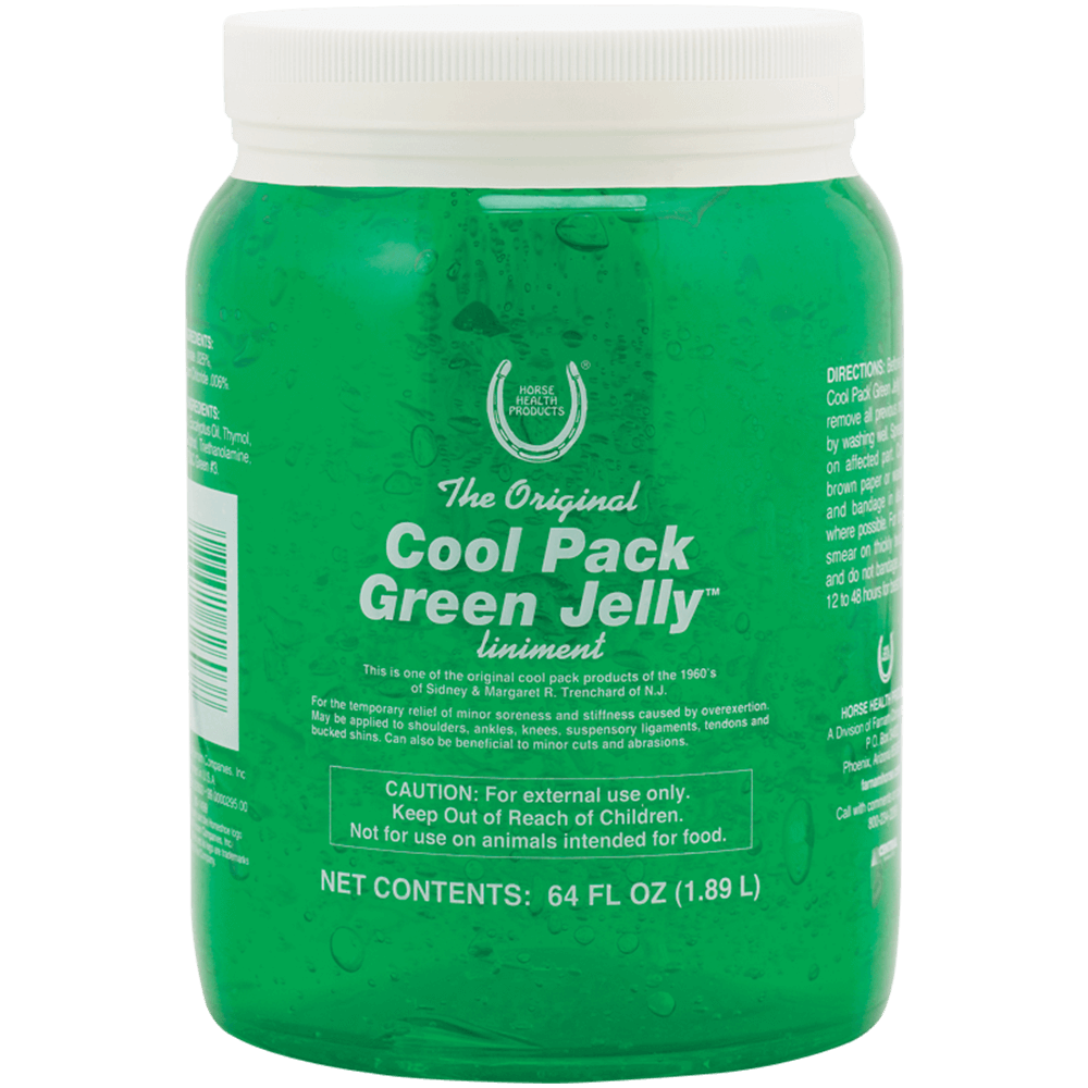 Horse Health Products Cool Pack Green Jelly Liniment 64oz provides fast-acting, cooling relief for sore muscles, tendons, and joints. Ideal after exercise or competition, it helps reduce swelling, stiffness, and inflammation while promoting recovery an