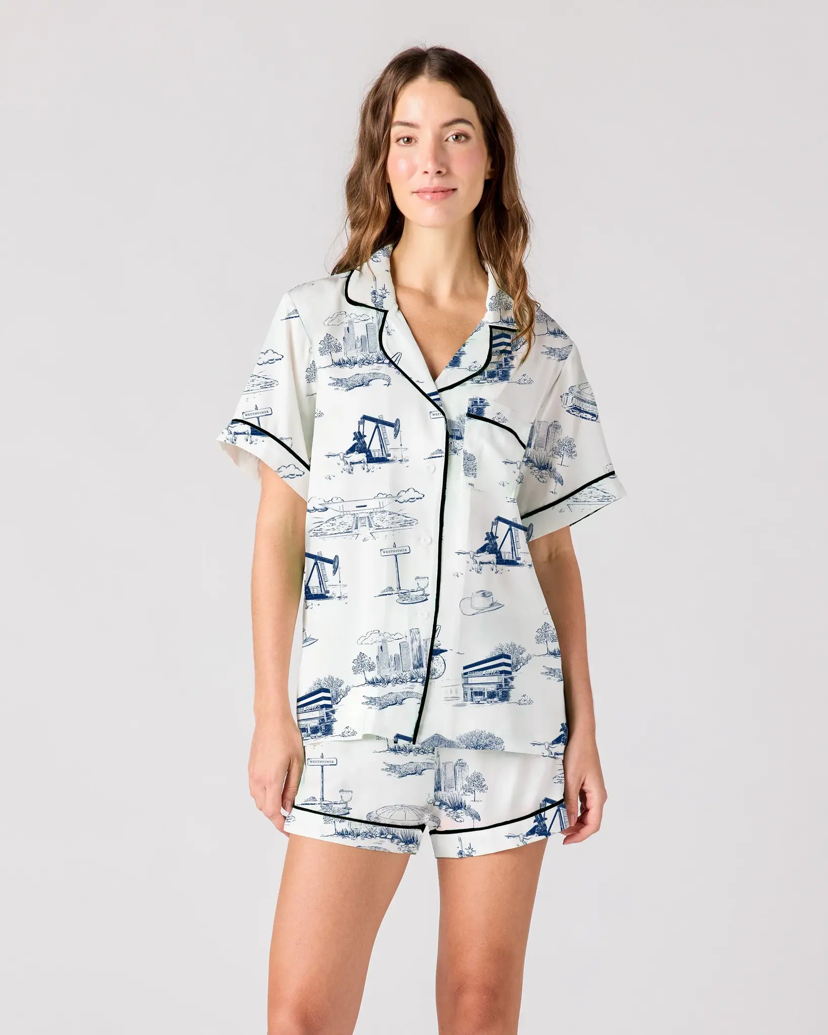 Katie Kime Houston Toile Pajama Shorts Set combines soft, breathable fabric with a signature Houston-inspired print. Designed for lightweight comfort, this stylish set is perfect for warm nights, lounging at home, or adding a unique city-themed touch to y