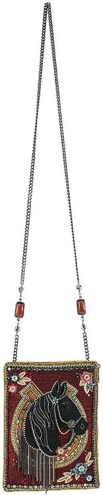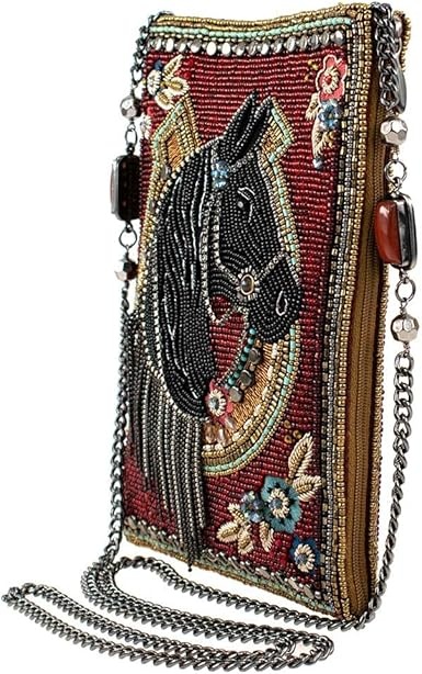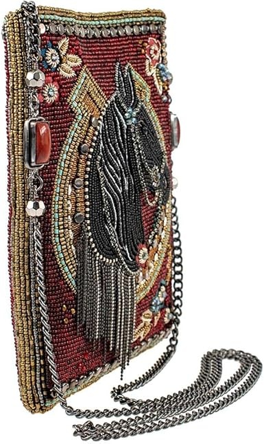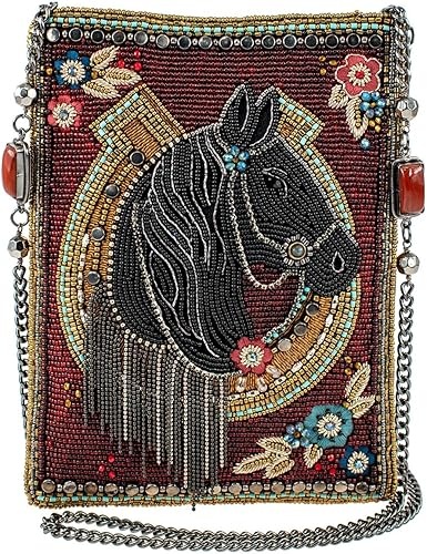 Mary Frances Let’s Gallop Beaded Black Horse Mini Crossbody Handbag features intricate hand-beaded detailing with a striking horse design. This compact crossbody adds a fun equestrian statement while carrying your essentials in style.