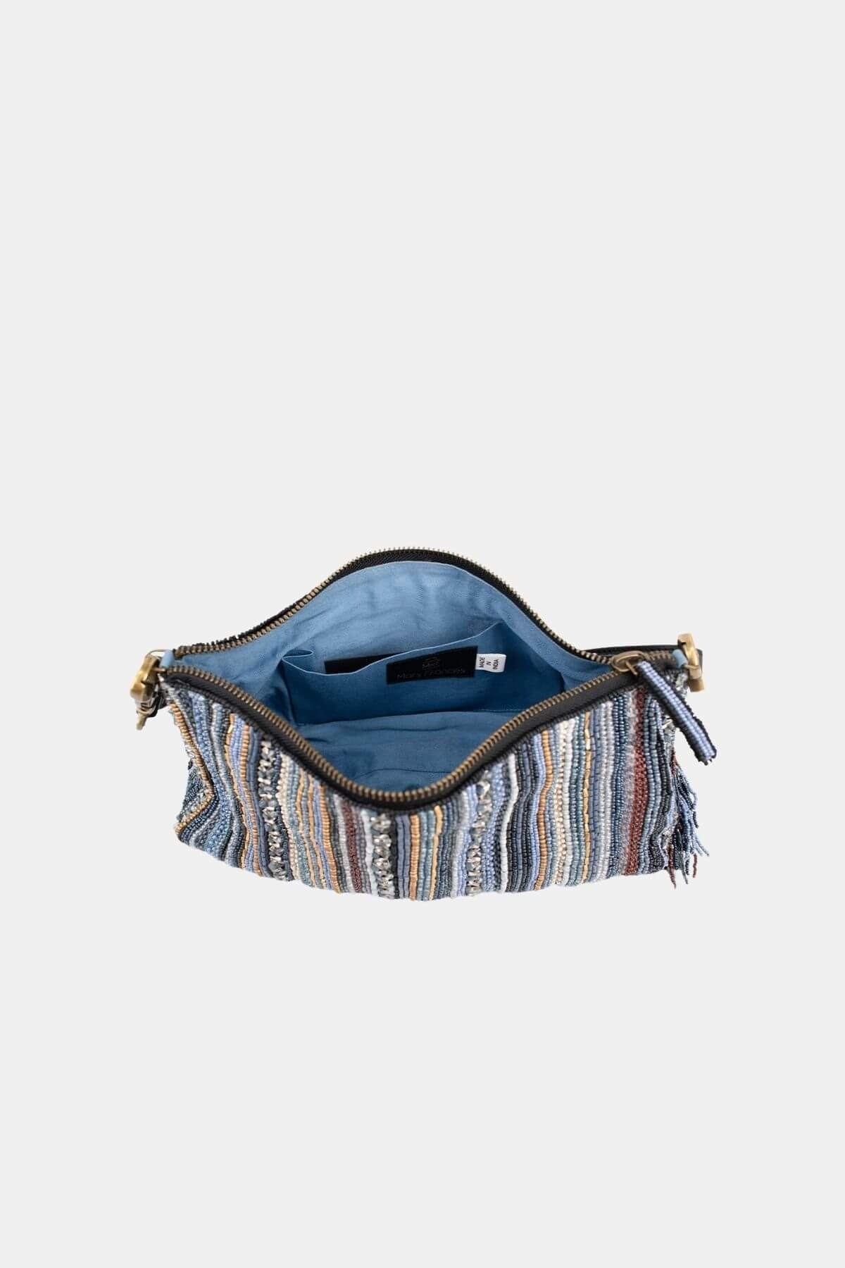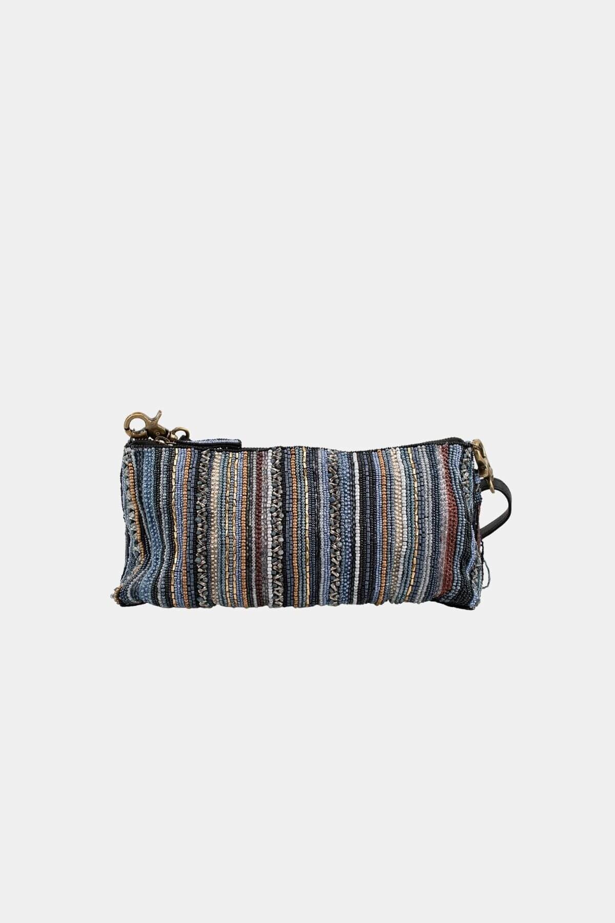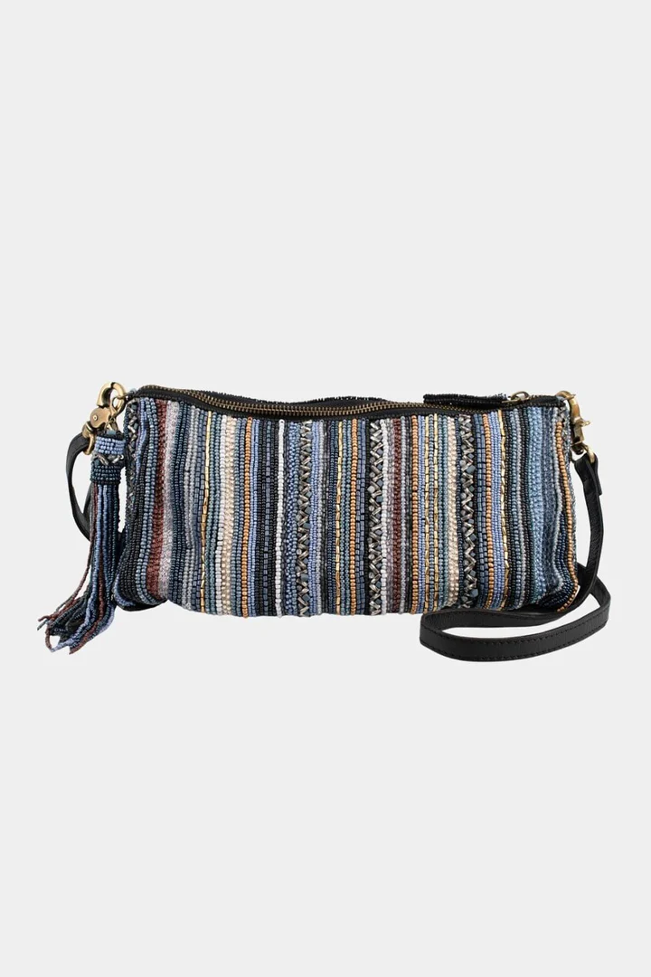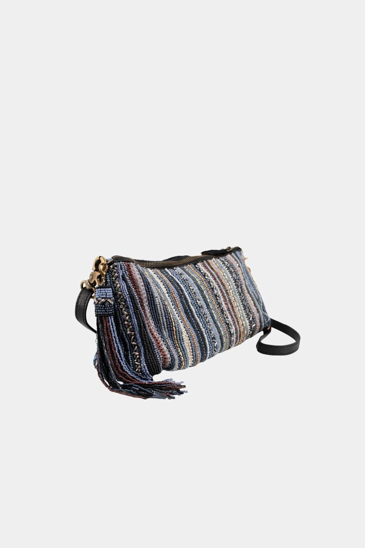 Similar to our beloved Between the Lines bag but reimagined in your favorite shades of blue. Hand beaded vertical stripes with earthy neutrals and a tassel accent make this versatile crossbody easy to wear day or night.