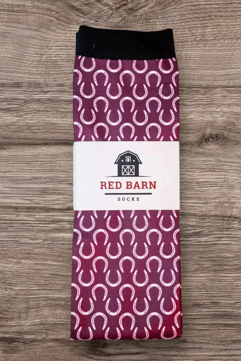 Bring a little luck to your step with Horseshoe Harmony - Red Barn Socks. These versatile boot socks come in a rich purple with white horseshoes and are perfect for horse lovers, ranchers, and Western lifestyle enthusiasts.