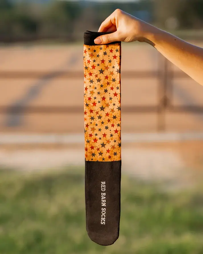 Aim high and shoot for the stars in this inspiring pattern! Made from a high-quality blend of cotton, polyester and spandex, these western boot-length socks are designed for ultimate comfort and the perfect amount of snugness to ensure they won't fall down. Breathability, softness and durability make these a perfect choice for work or play. One size fits all Boot sock length