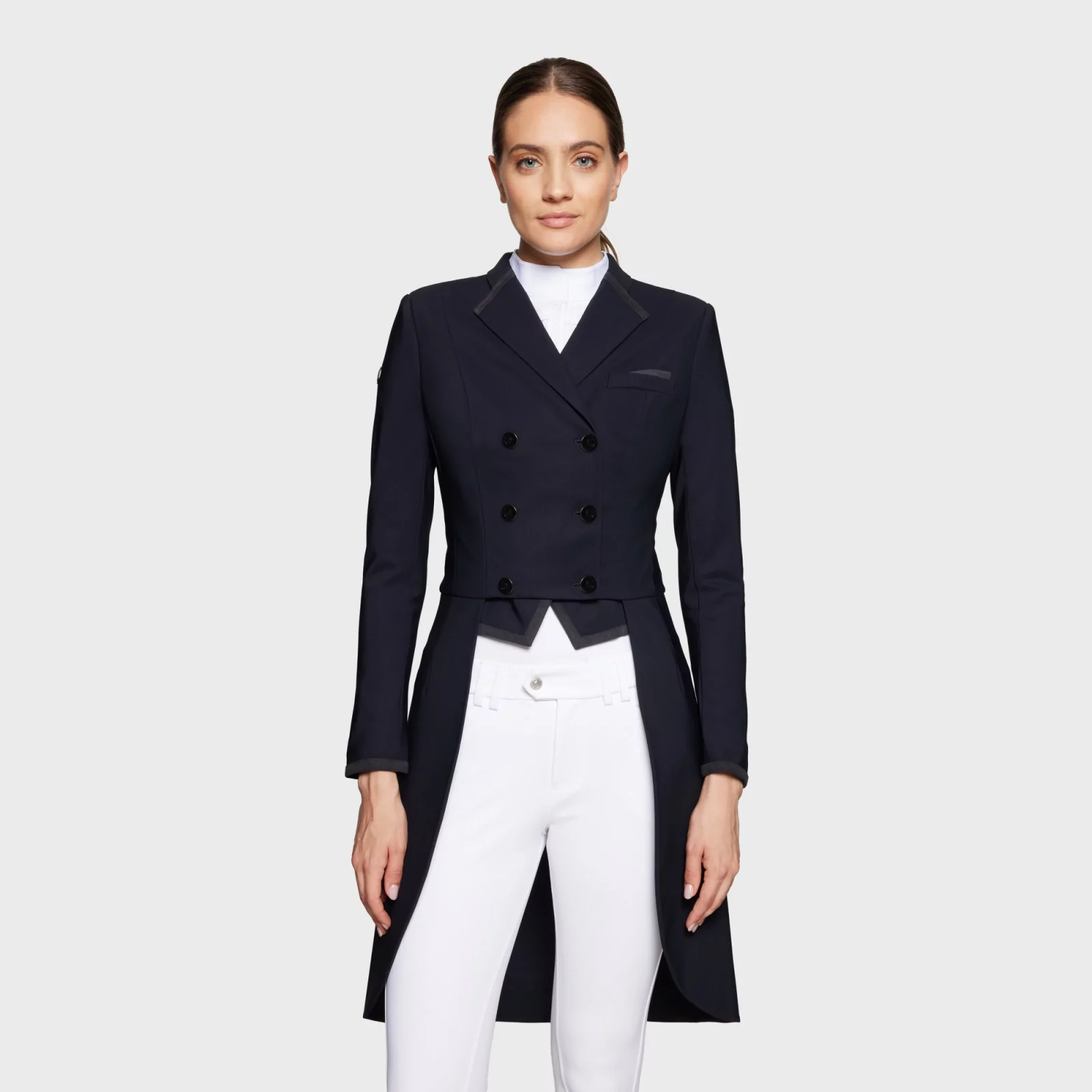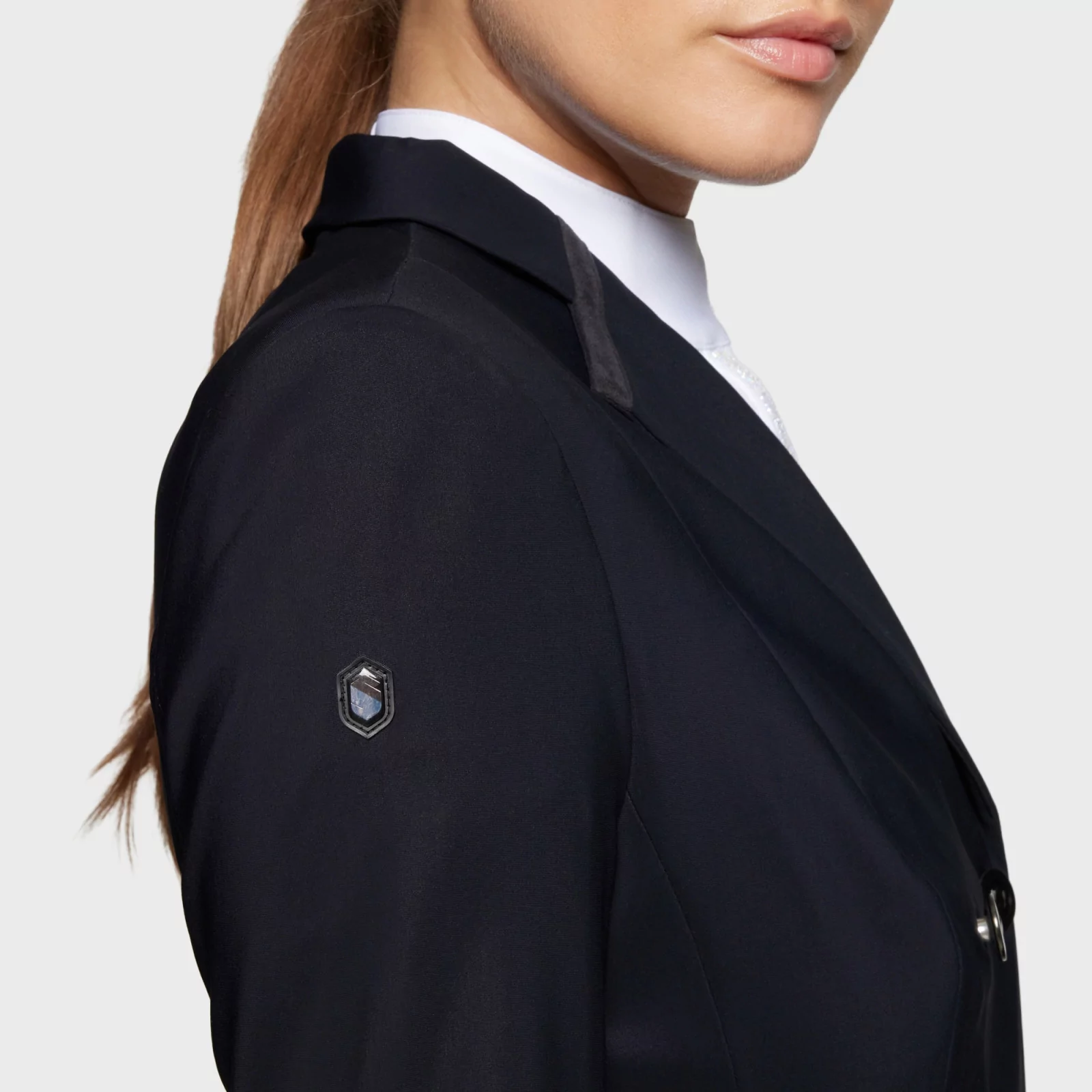 It combines high-quality Italian fabric with four-way stretch for superior comfort and movement. It features a breathable mesh lining, an inner zipper under the button fastening for an elegant fit, and removable tail weights for customization. Luxurious Alcantara finishes add a subtle touch. Machine washable at 30°C. Composition: 73% PA, 27% EA.