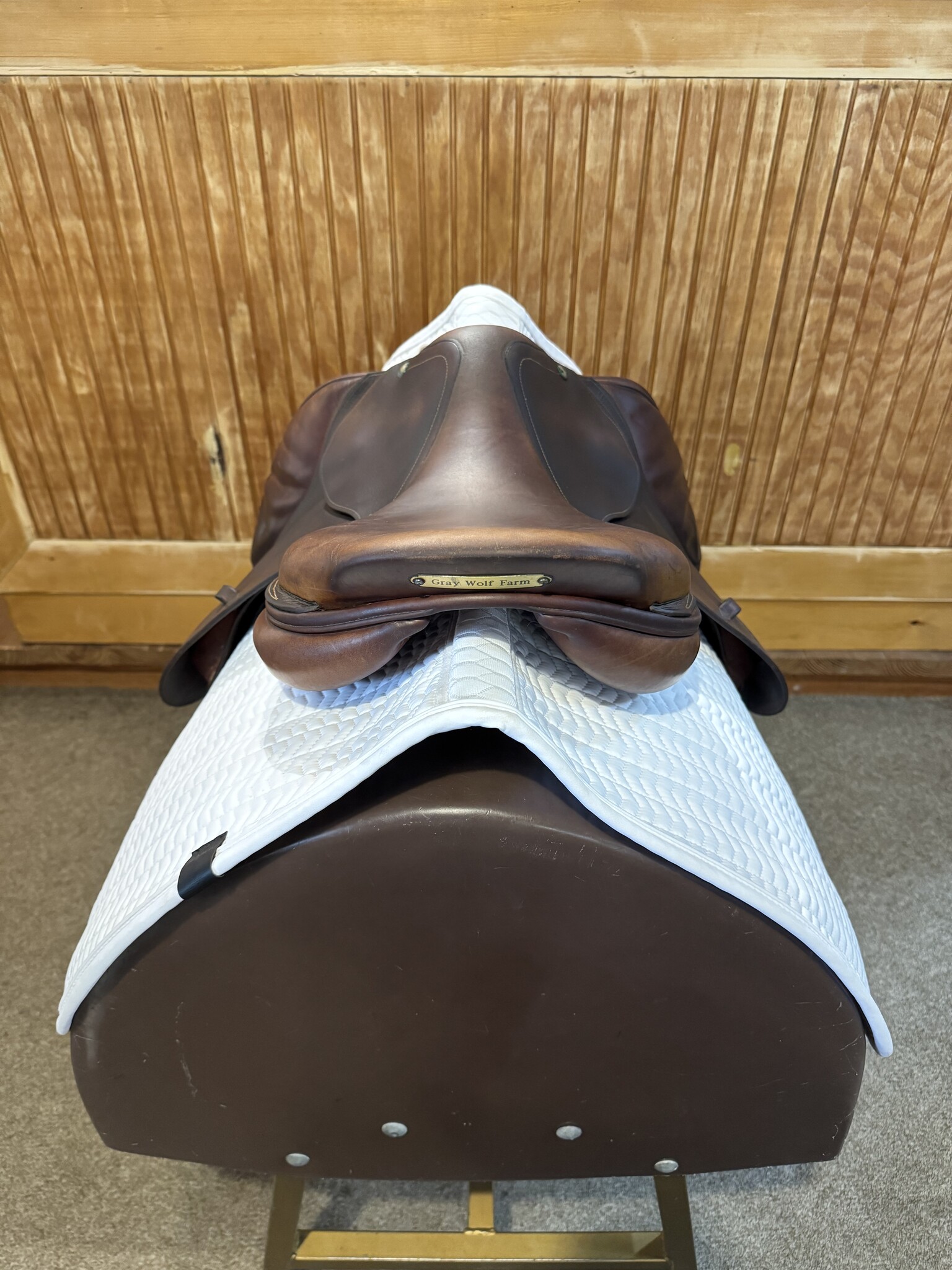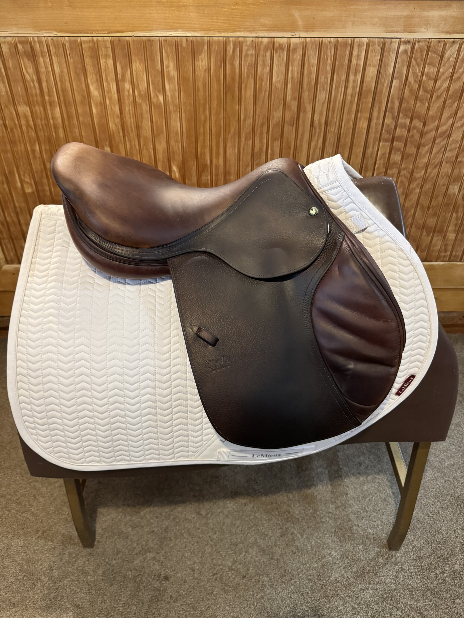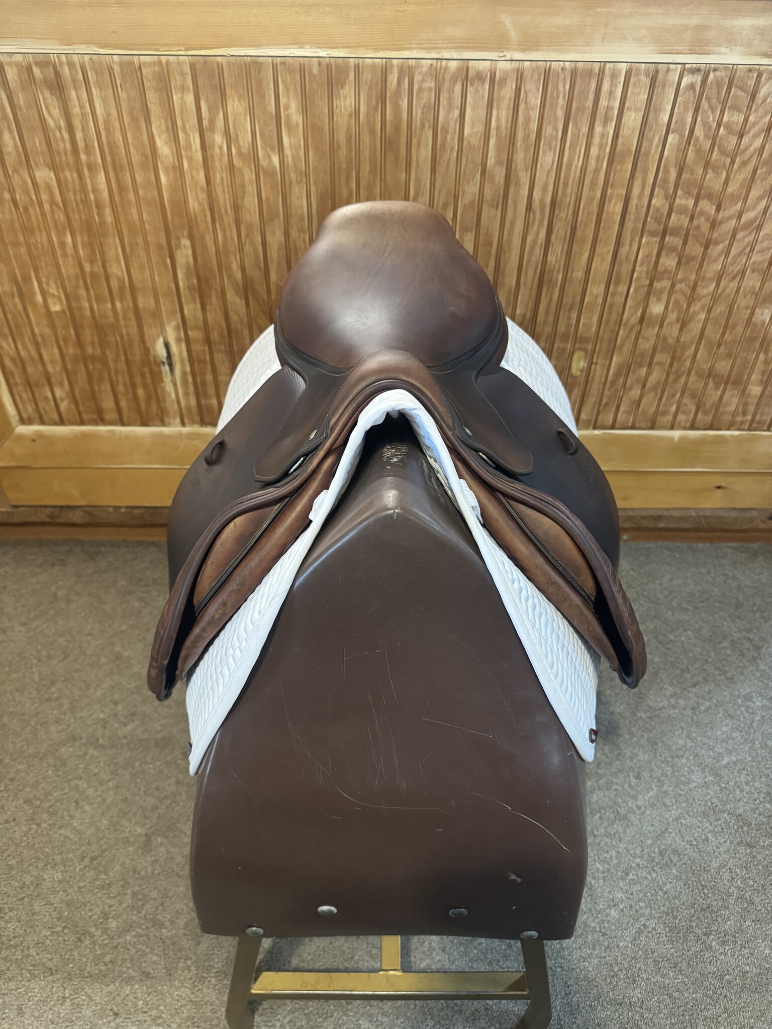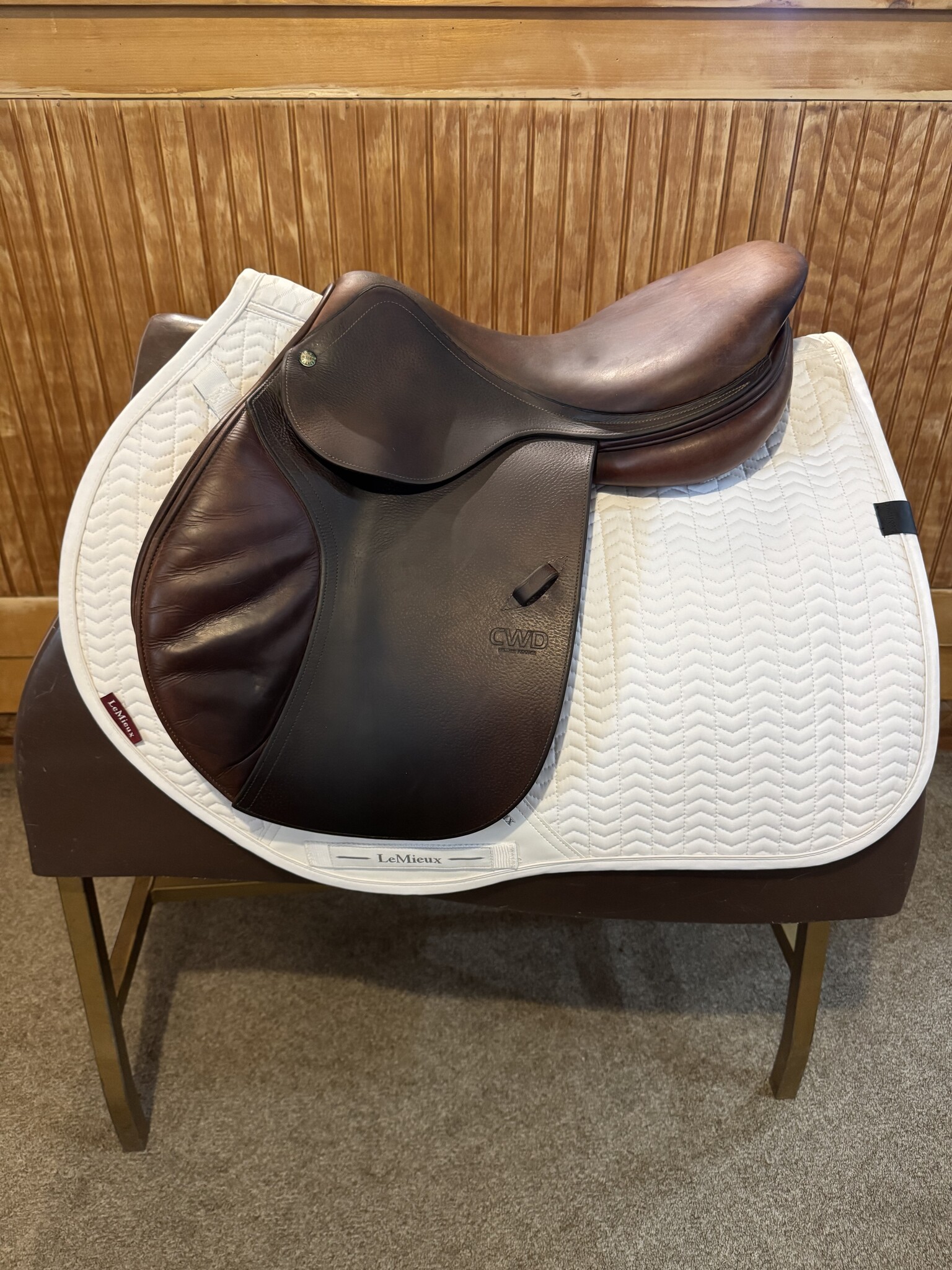 Used CWD jump saddle with a 17” seat, medium tree, forward flap with long panels. Quality French leather saddle with custom panel configuration (1096, PA 7.5/3/5). Well maintained with normal wear and no major damage.