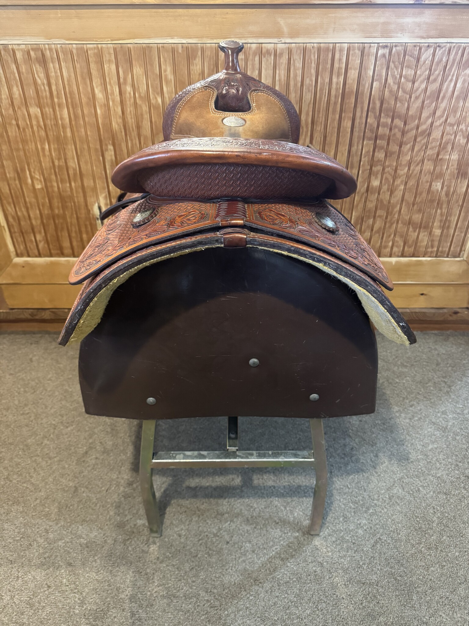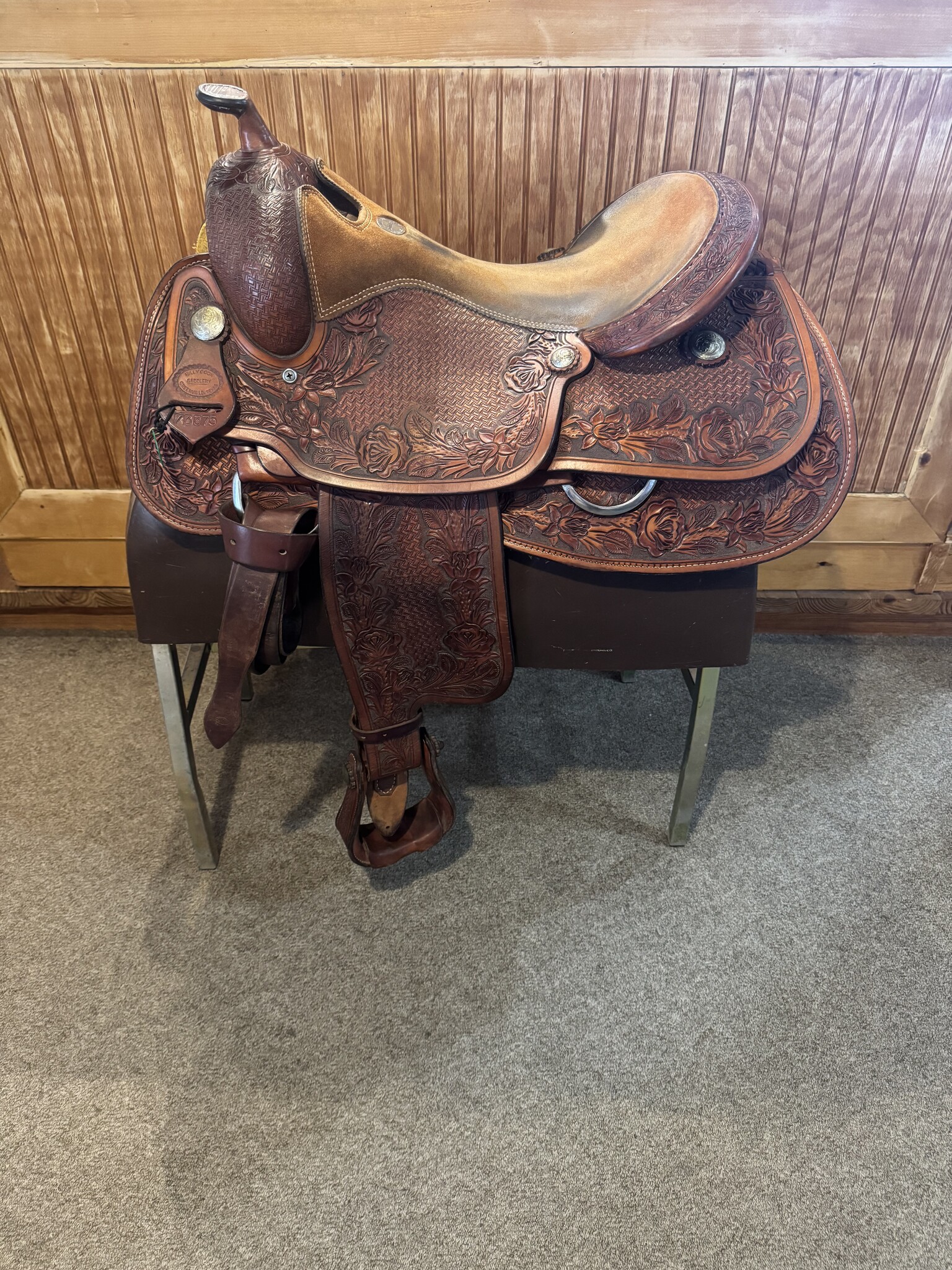 Built for performance and rider comfort, this saddle offers a secure, balanced seat ideal for reining and everyday western riding. This saddle is used but in good condition, showing normal wear from use.