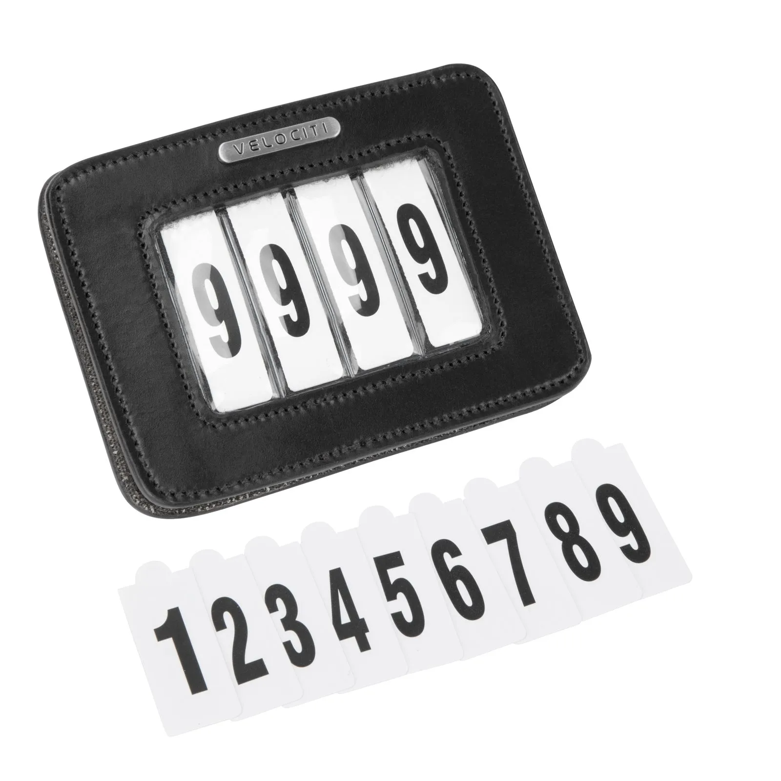 This leather, rectangular holder has a wipe clean slot sleeve, and comes with four sets of numbers 0-9. It has a large safety pin attachment on the back. Dimensions 3" x 4".