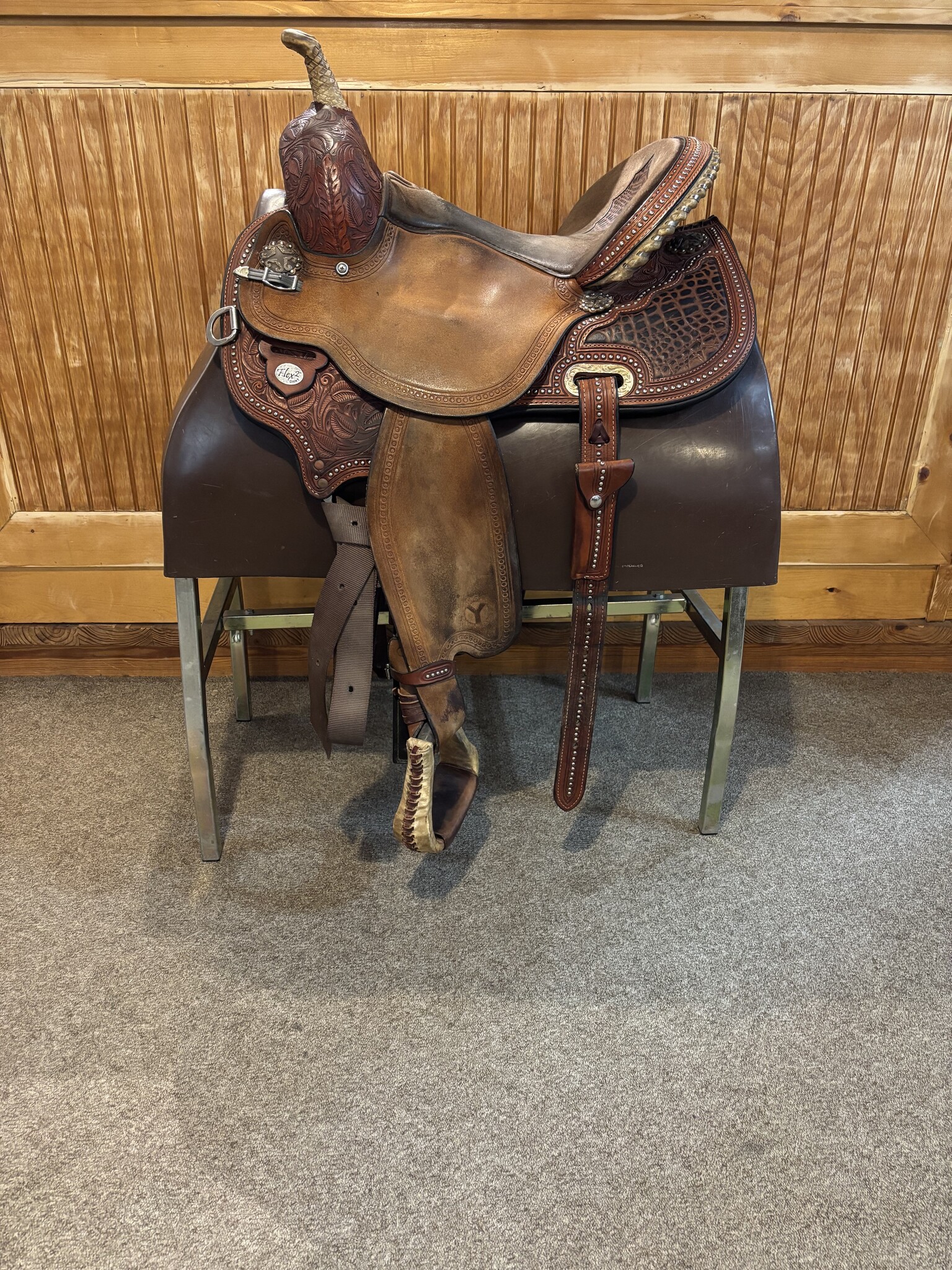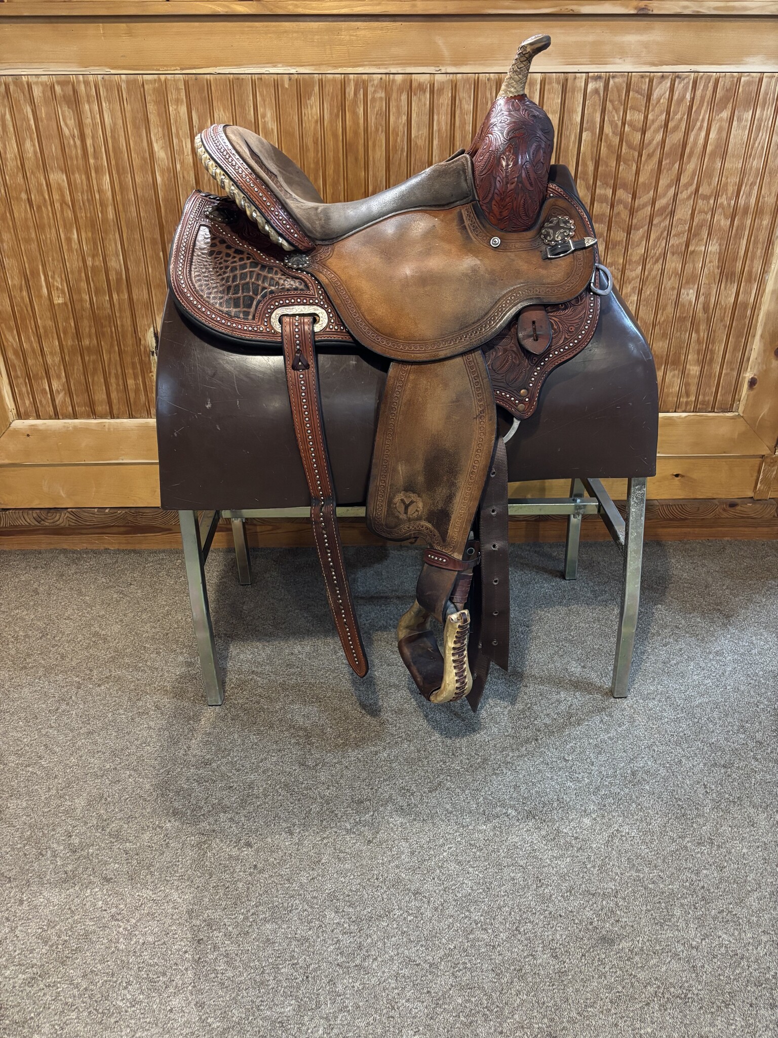 Used 15" Wide Circle Y Kelly Kaminski Studded Croc Barrel Saddle (2014). Features a deep seat, roughout leather, croc print accents, and silver studs. Wide tree fits broader horses. Stylish, secure, and built for speed—perfect for barrel racing!