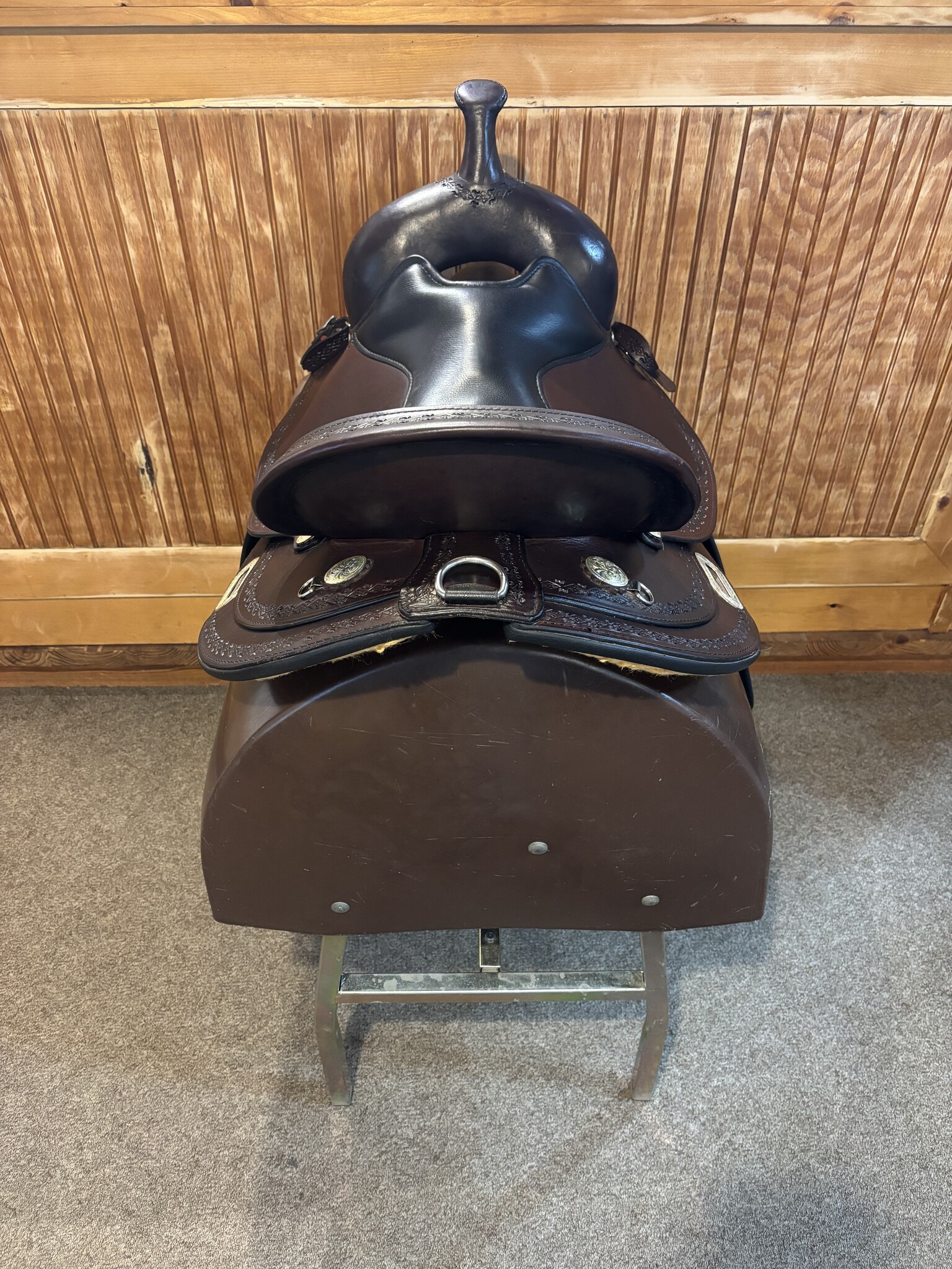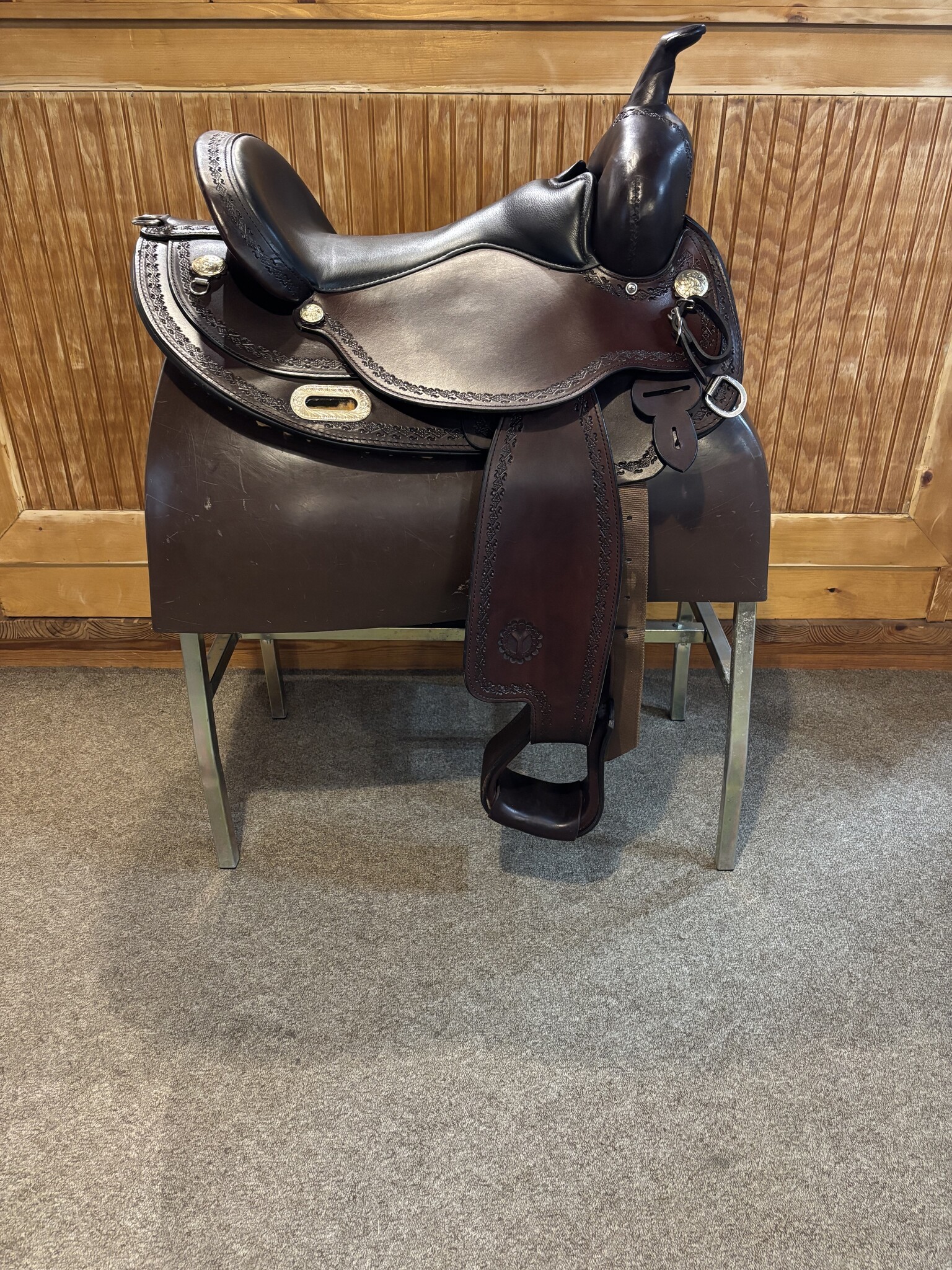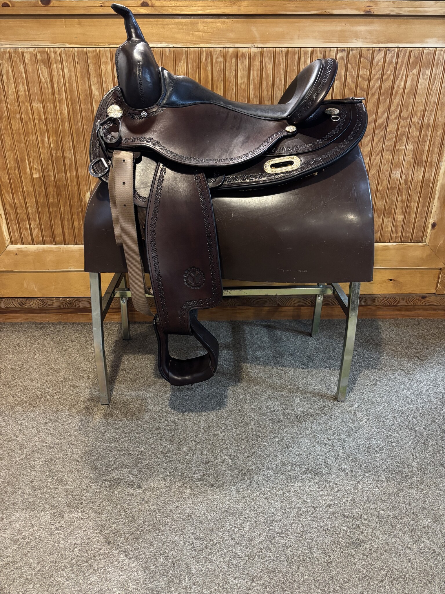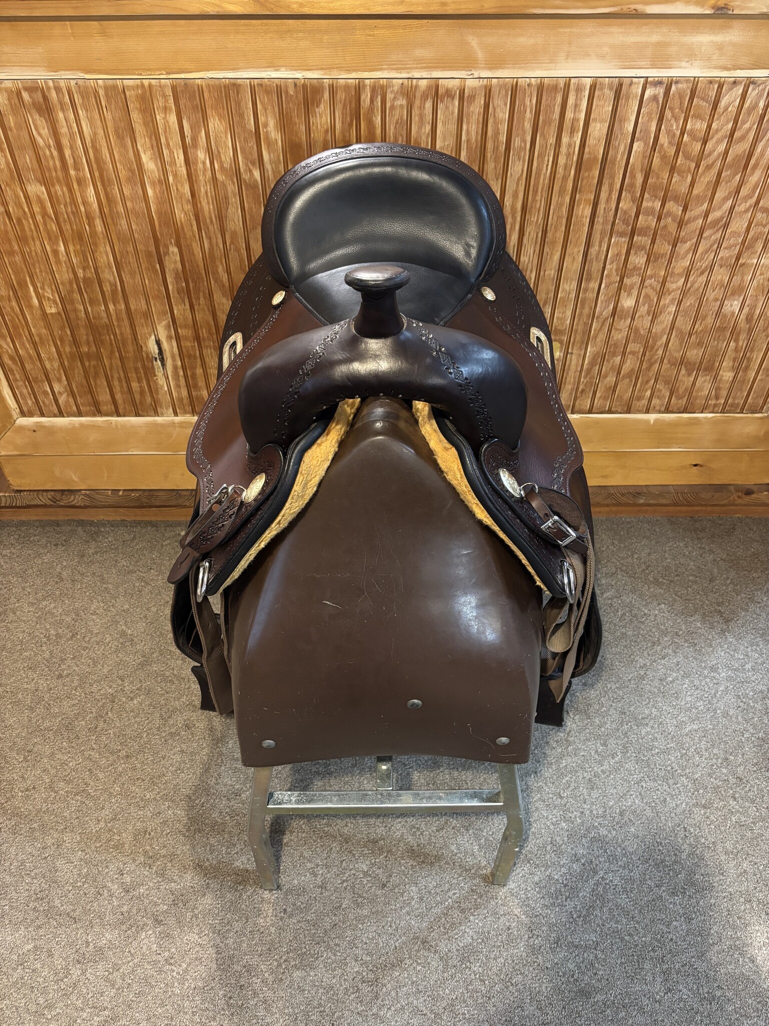 Used 17" Circle Y Oasis Arab Flex-Lite-Diamond saddle with regular tree and Flex-Lite technology. Designed for Arabian build, it offers a lightweight feel, Diamond tooling, and all-day comfort—perfect for trail, endurance, or pleasure riding.